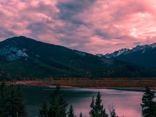 Pink Cloud Sunset Dazzles Over Mountain Lake